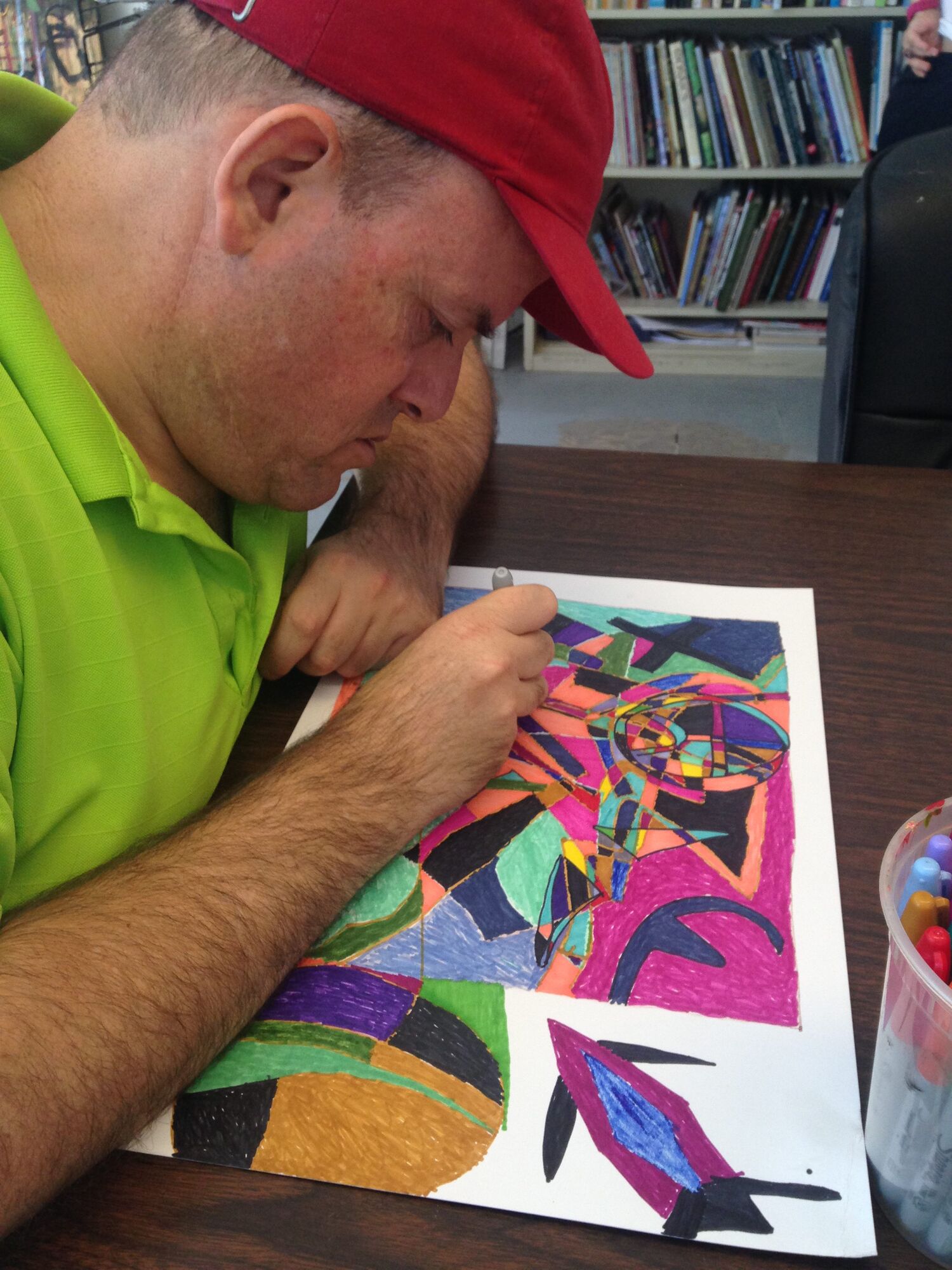 Alpha operates SlingShot Art Forum, an open art studio and gallery supporting about 40 working artists with intellectual disabilities.[/caption]