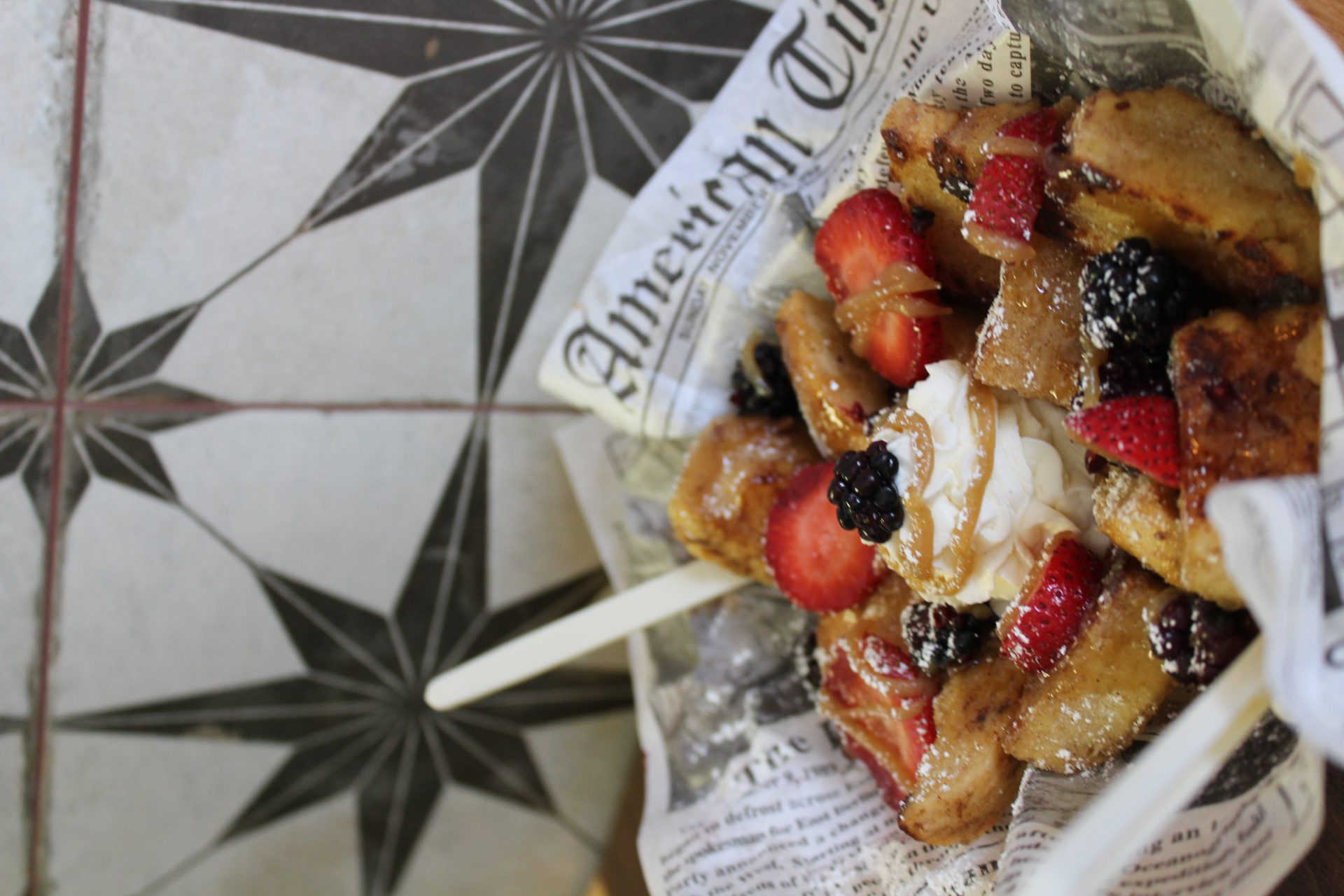 There is also the French Toast bagel with cinnamon sugar, soaked in eggs, cinnamon, cream and vanilla bean then baked and topped with powdered sugar, blackberries, maple syrup and caramel.