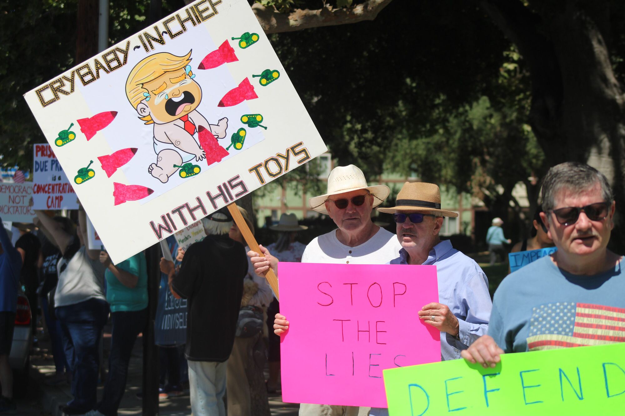 For the third time this year, local demonstrators lined up in front of the Solvang Veterans Memorial Building on Saturday, Aug. 16, to protest the policies of President Donald Trump. The latest demonstration, was titled “Protect Our Checks,” amid concerns that the president’s policies will threaten Social Security.