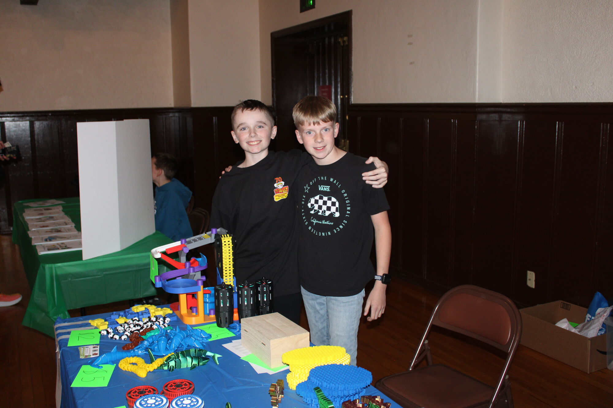 Next to Berkeley's table, were a couple of friends — Joseph Brown and Mason Morton — who put their interest in 3D printing to good use. The two had a tableful of plastic products like wall outlets covers, figurines, keychains, and fidget contraptions. But their signature creation was a "marble run" that moved a marble up via a small conveyor belt and a path of gullets and ramps where the marble traveled to the bottom.