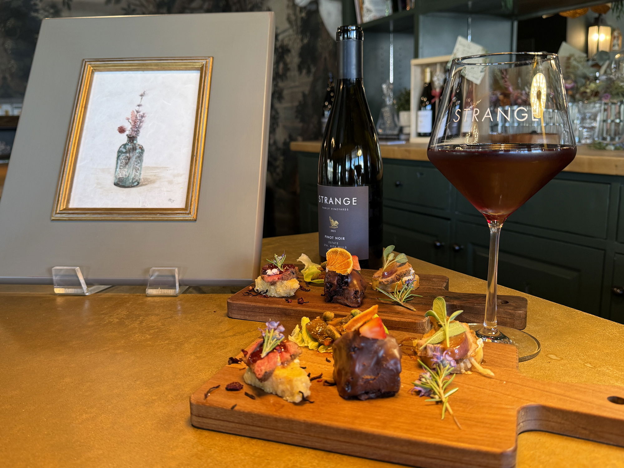 This unique event showcased the collaborative efforts of three local professions: Chef Brittany Rice, artist Michelle Feldman, and apothecary Cassaundra Einolander. The evening was designed to captivate and delight all of the senses. Set within the aesthetically captivating Strange Family Tasting Room, guests enjoyed an evening exploring a multitude of senses. Along with wine tasting and mocktail delights, still-life paintings of Feldman were on exhibit, and small bites by Rice, of Rustik Farm Co., enhanced the taste dimension accompanied by four of the Strange Family's finest wines. Additionally, Einolander, of Goat Barn Apothecary, presented a selection of herbal remedies and body care.