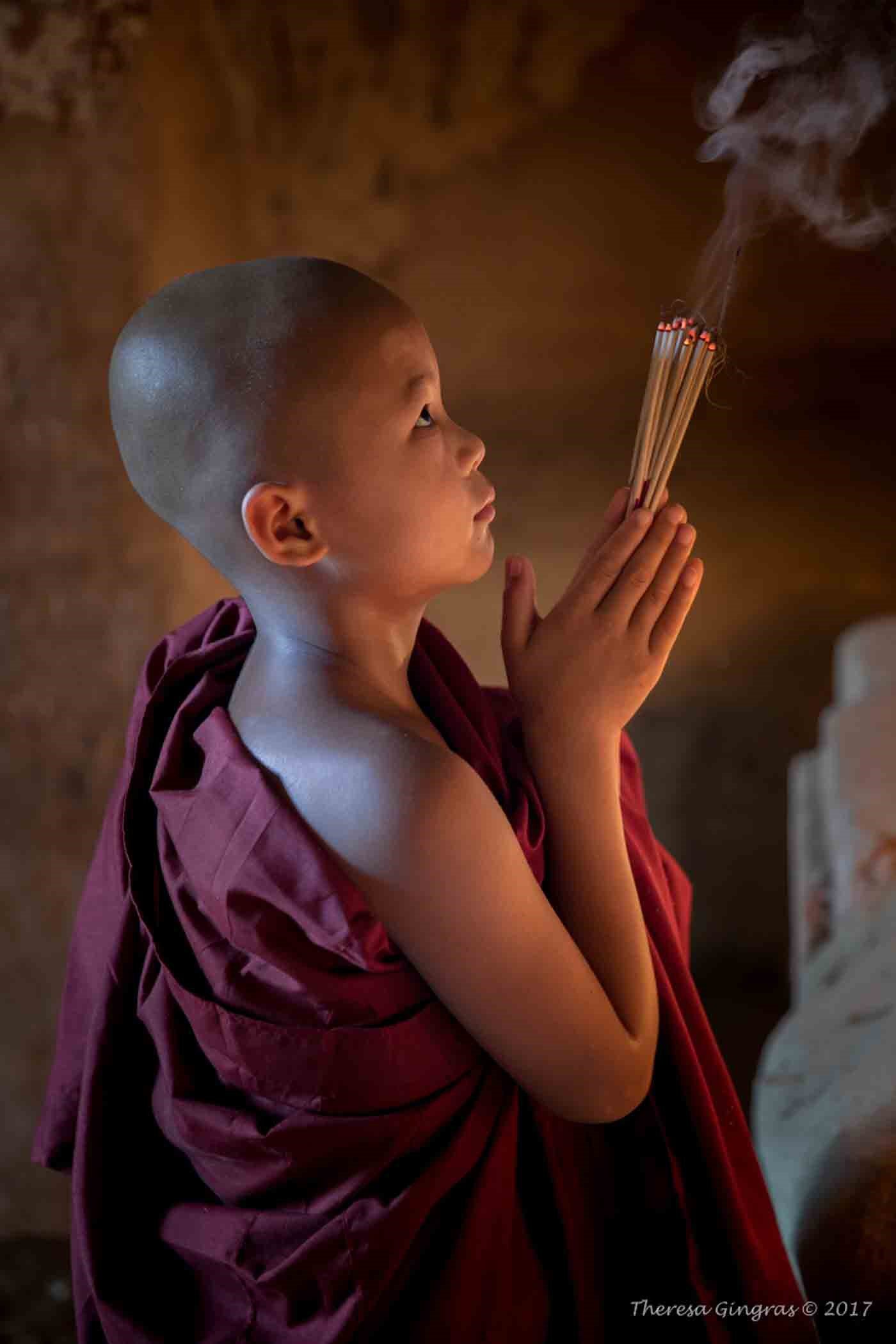 Young Monk with Incense (image copyright 2017 by Theresa Gingras)[/caption]