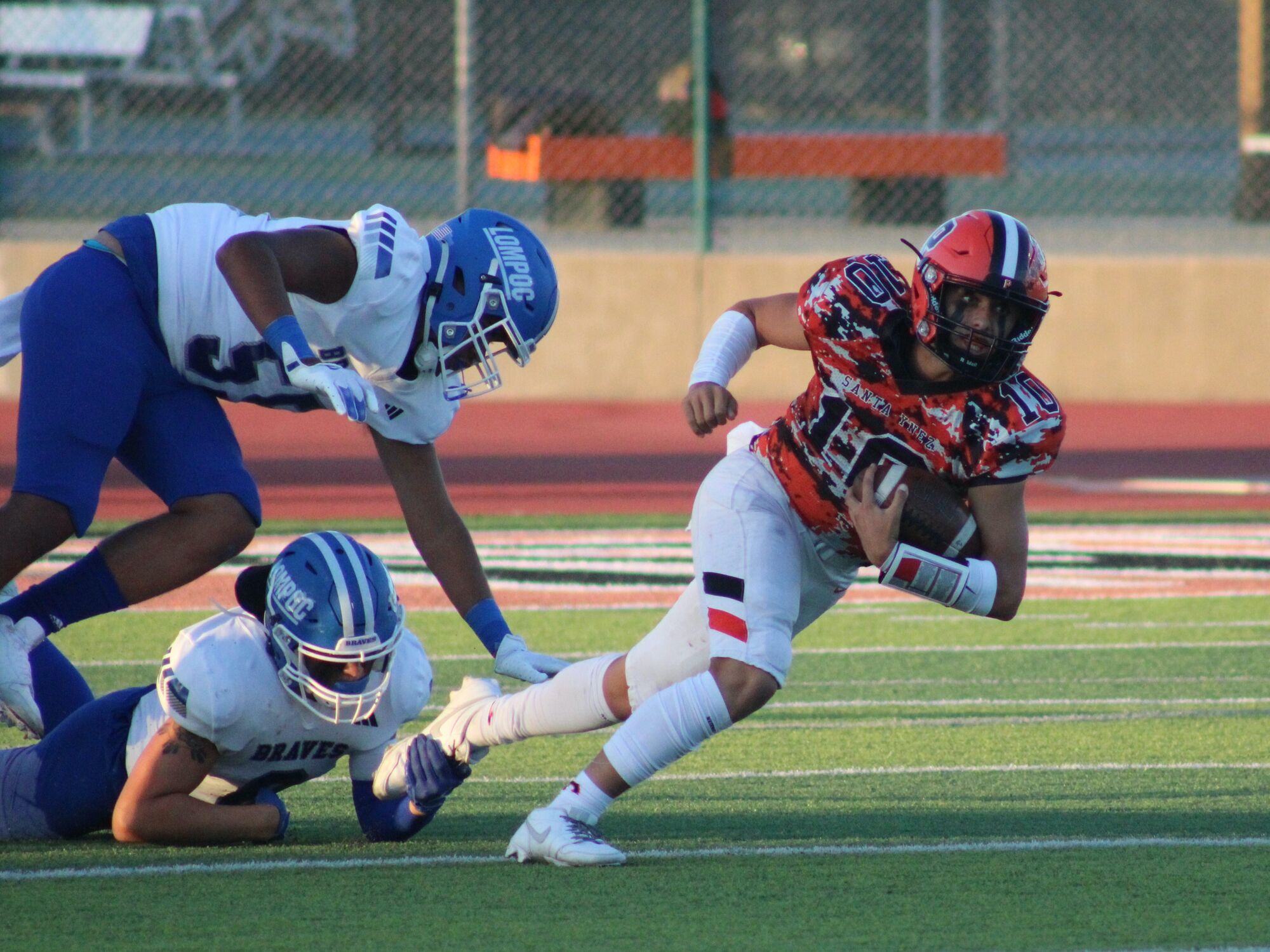 Santa Ynez got the ball back and drove down to the Lompoc 23-yard line but was stopped on downs. Soon after, Braves running back Jacob White took off on a 74-year touchdown run for a 14-0 lead.