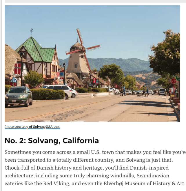In 2024, Solvang was nominated by a panel of experts and the 10Best editorial team for the USA TODAY 10Best Readers’ Choice Awards in two different travel categories: “Best Small Town in the West” and “Best Main Street.” The travel awards contest and online voting launched for the “Best Small Town in the West” category on Monday, March 4, and online public voting ran through Monday, April 1. (Results for the “Best Main Street” awards category have not yet been announced.)
