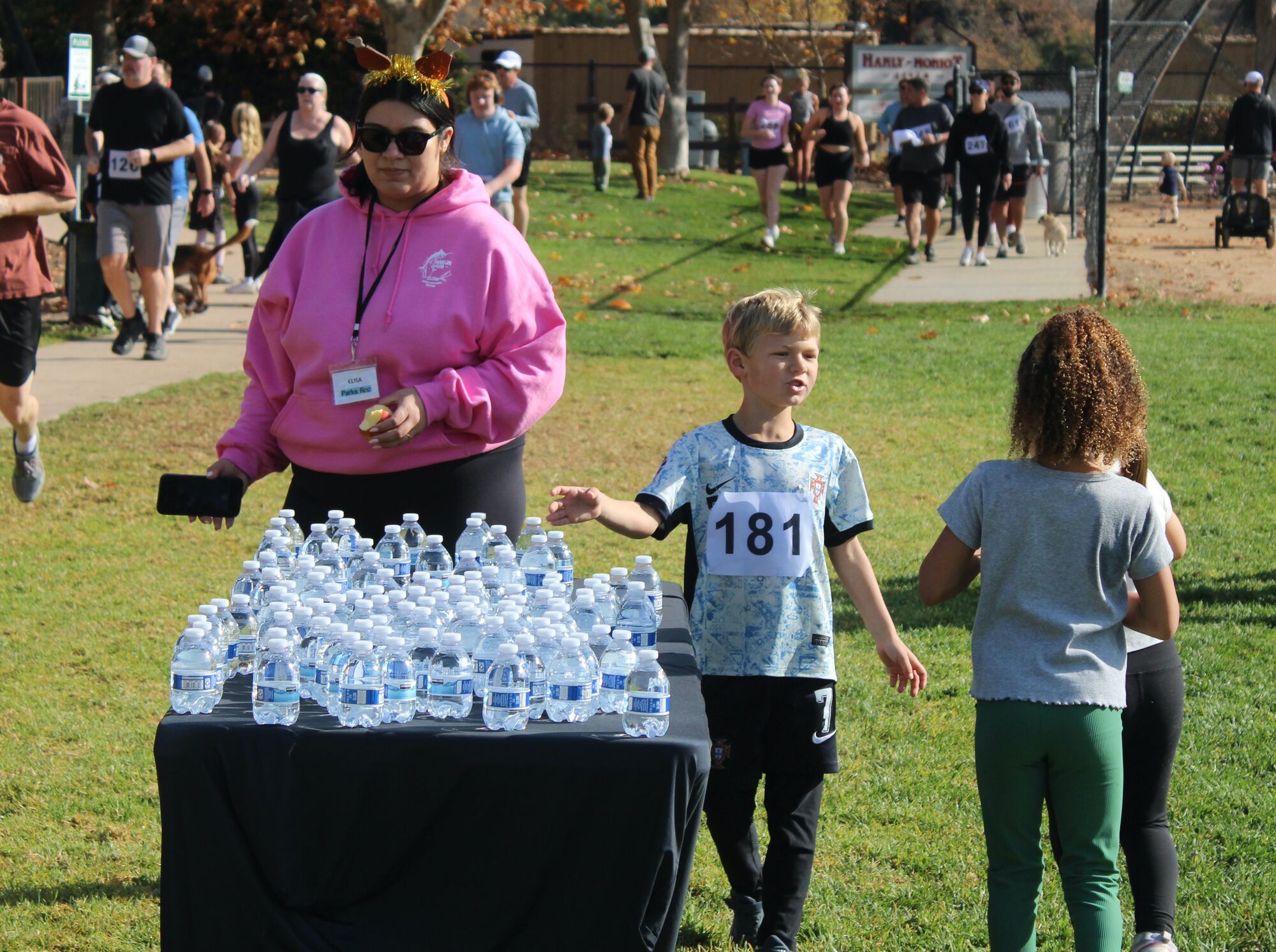 Longtime Parks and Rec staffer Fred Lageman contributed to the atmosphere as the emcee, counting down to the start of the run, and then keeping the participants going by serving as DJ and putting on songs all throughout the event. Meanwhile, Recreation Clerk Elisa Monroy and the department's newest employee, Recreation Coordinator Jalen Gragston, were on the move handing out water to those who wanted it, and giving medals for kids and adults who completed a lap.
