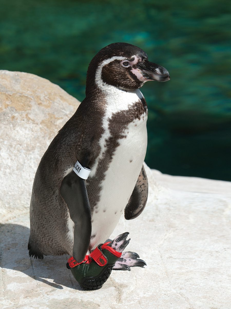 Photo by Tony LunaLucky is shown wearing one of his high-tech shoes designed by Teva, which allowed him to walk and swim, and be a part of the Santa Barbara Zoo’s penguin colony.[/caption] “Although this is a fairly straightforward surgery and used for cats and dogs with a similar condition, there are some other considerations for performing this in a bird,” Barnes said. “We feel he has a good prognosis and this procedure will give him the best quality of life. Our goals are to lessen Lucky’s pain, retain his mobility, and have him rejoin the zoo’s Humboldt penguin colony.” Lucky’s need for surgery stems from the deterioration of a malformed ankle joint, which caused his right foot to point up at an angle, rather than lay flat. This caused Lucky to walk on the point of his ankle, rather than on his foot. The abnormality was discovered as soon as Lucky left the nest in 2010 and walked with a shuffling gait. He was unable to walk properly and began to develop life-threatening infections from pressure and chafing. In 2011, local shoe company Teva designed a high-tech shoe for the penguin, and since then has further refined and provided custom shoes for Lucky, free of charge. The footwear has been effective for the past eight years, allowing him to be an active member of the zoo’s penguin colony. In 2017, he sired a chick with his mate Nica. But Lucky’s ankle joint was undergoing a continual deterioration, as expected with this type of deformity. The joint was collapsing and becoming inflamed, causing swelling and pressure. Excess bone (or calcification) had formed in the joint, causing painful bone-on-bone contact. “Lucky’s condition had reached a critical stage as it was difficult to manage his pain effectively,” adds Dr. Barnes. Lucky was allowed to recover in the Animal Hospital for several weeks, accompanied by his mate Nica, with the focus on healing from surgery. Once he is fully healed, efforts will begin with Teva to develop a new shoe. For more information, go to www.sbzoo.org.