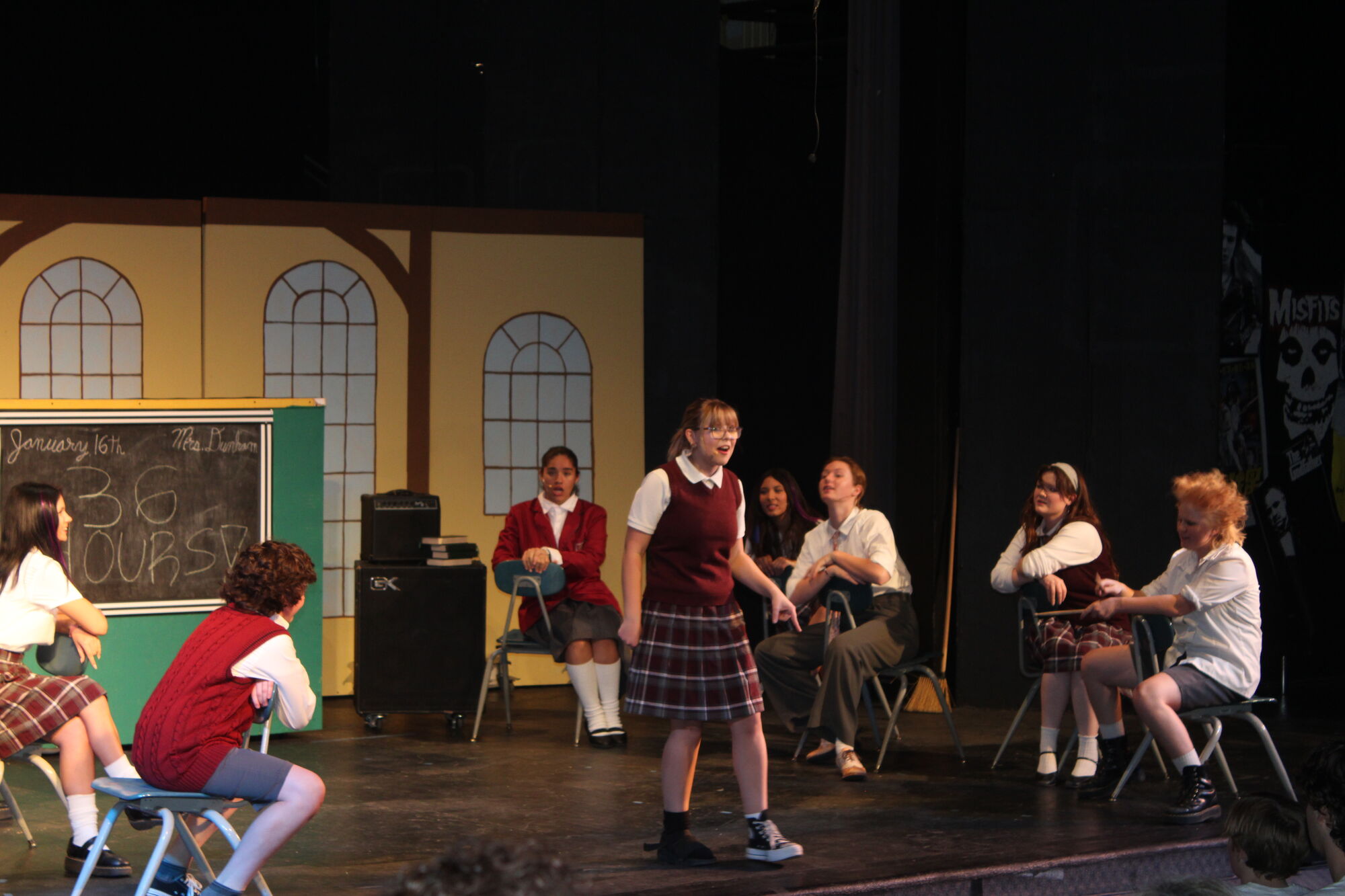 The show, in this case the matinee on Saturday, March 15, featured several musical numbers, and in some of them the actors ventured off the stage and into the aisles to perform. One example was "If Only You Would Listen," as the Horace Green students stood along the front of stage and up each aisle, while singing about their frustration over parents' expectations. Another was Laliberte performing "Where Did The Rock Go?," from the back corner as Ms. Mullins begins to soften her no-nonsense exterior. And, there was even a moment when the actors tiptoed through the rows of spectators to simulate their "sneaking out" for their "Battle of the Bands" audition before the principal could catch them.
