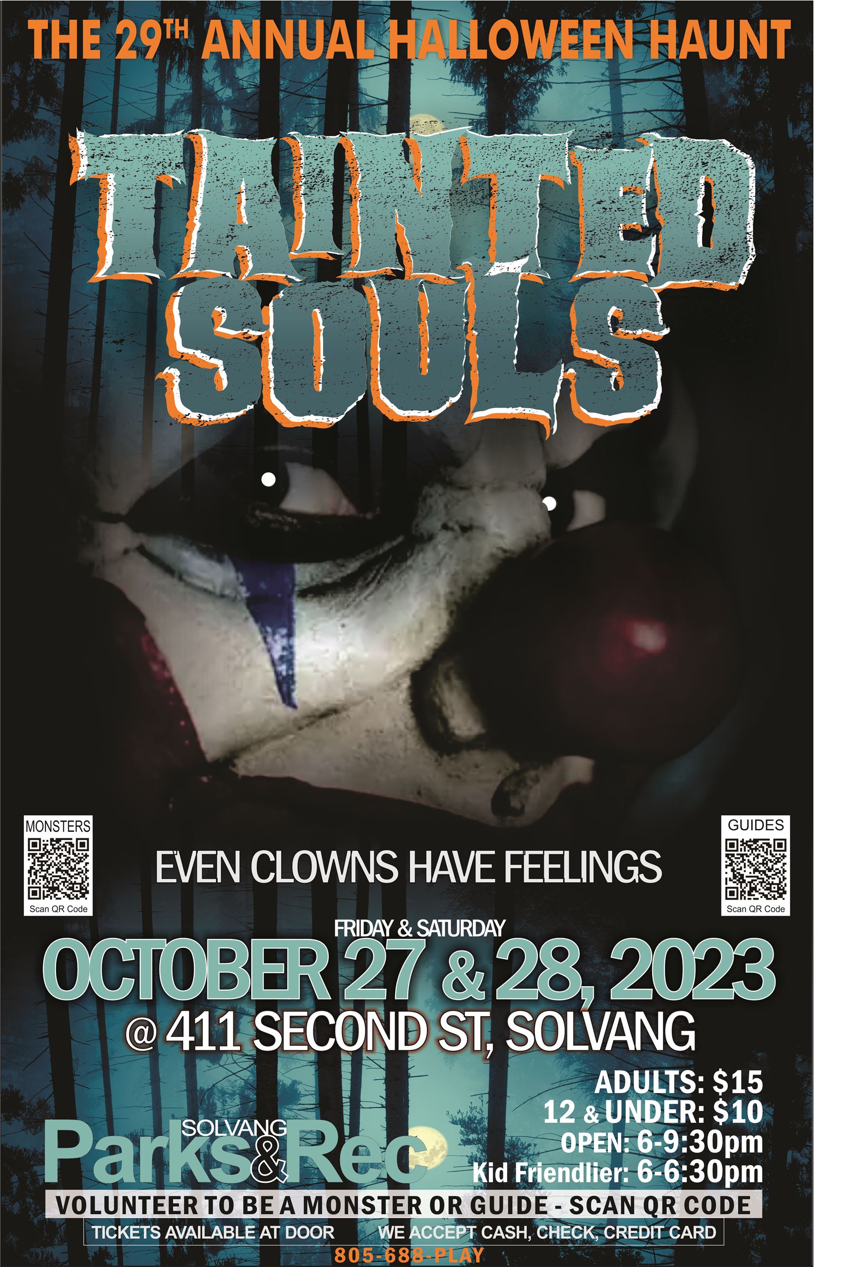 While pumpkins are popular this time of year, so is seeking out eerie and unsettling, but mostly fun, activities such as the haunted house put on by the Solvang Parks and Recreation Department. This year's 29th edition of the Halloween Haunt is themed "Tainted Souls: Even Clowns Have Feelings" and will be open on Friday, Oct. 27, and Saturday, Oct. 28, at 411 2nd St. in Solvang. Each night will kick off with a more kid-friendly version from 6 to 6:30 p.m., and the more "grown-up" version will continue from that point until 9:30 p.m. Admission is $15 for adults and $10 for ages 12 and under.