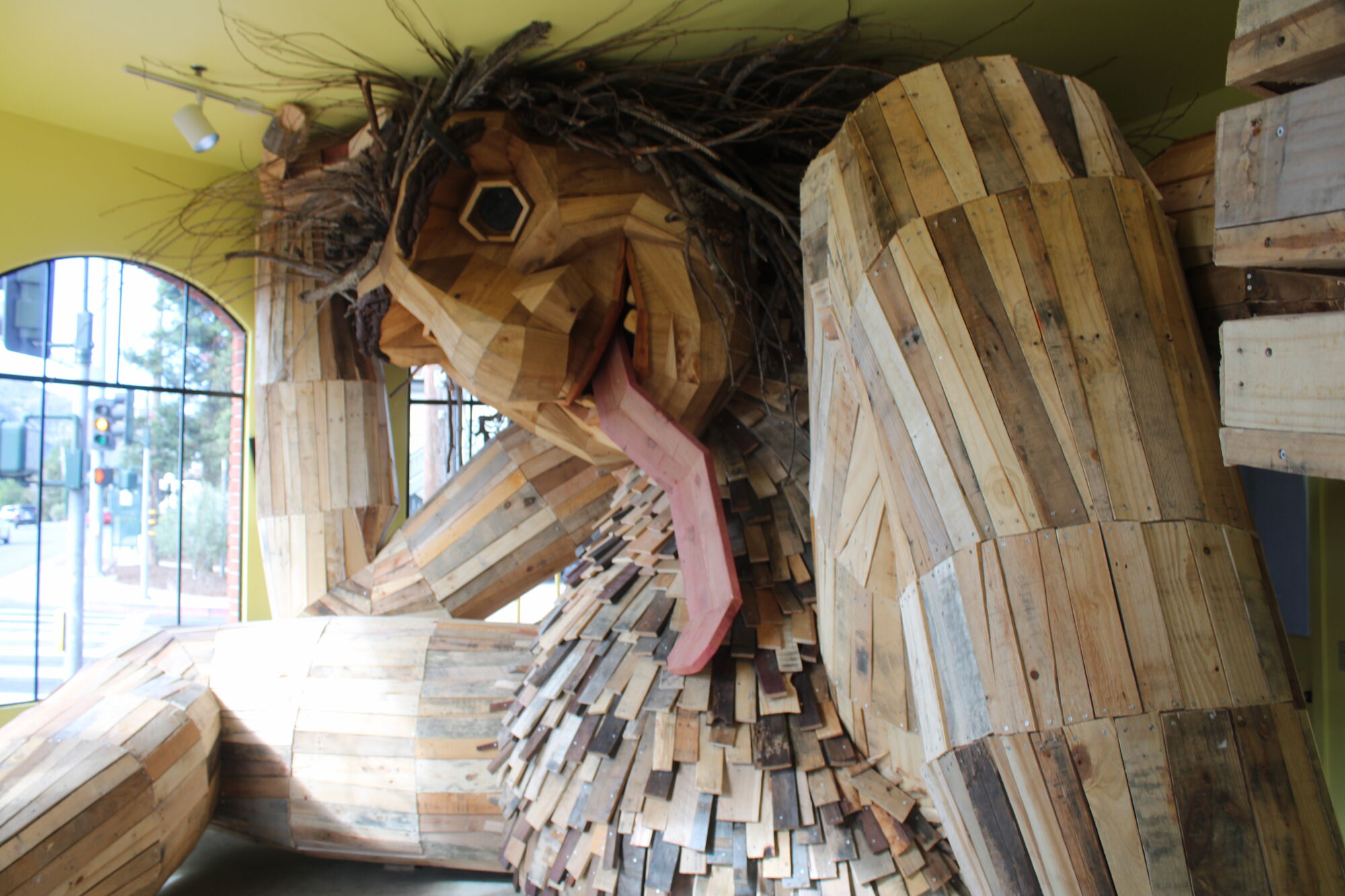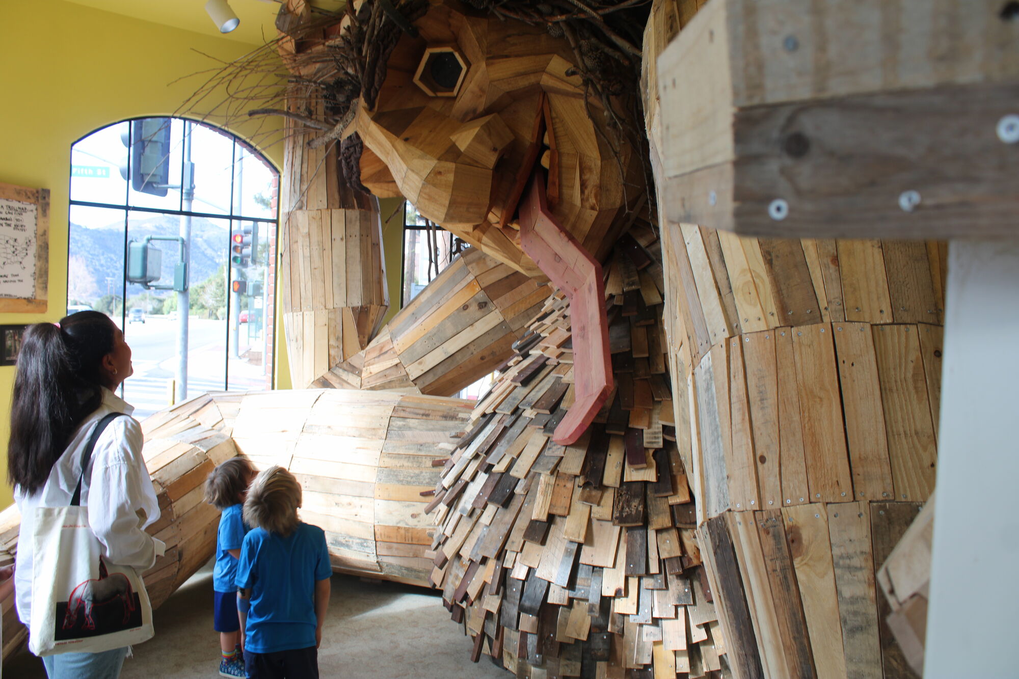 Her name's Lulu Hyggelig, and she lives inside the Michele Kuelbs Tower Gallery at the California Nature and Art Museum. She's the latest wooden trolls created by Danish artist Thomas Dambo, who at the end of 2024 had created 154 trolls around the world, all made from recycled materials.