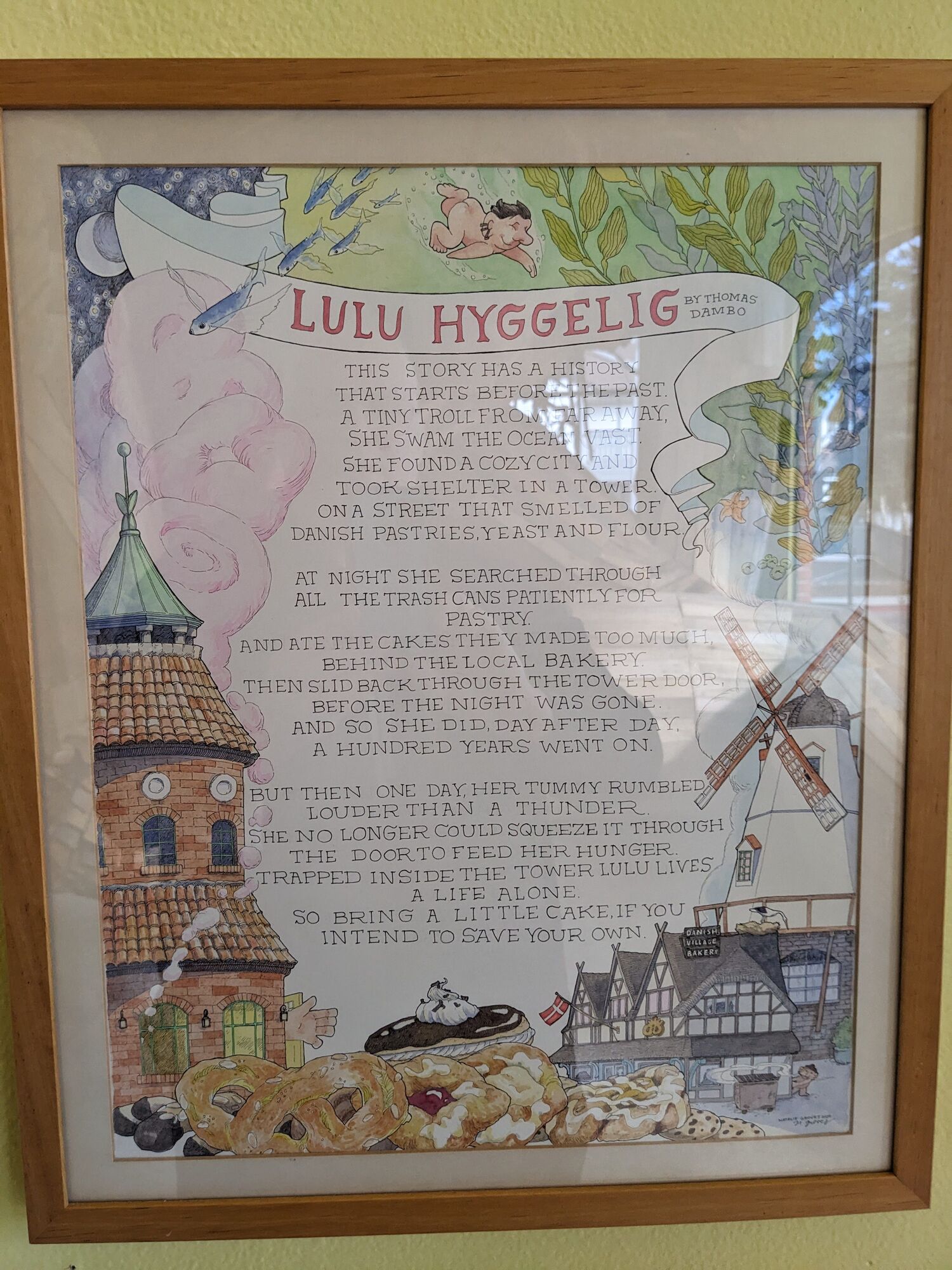 Dambo likes to give each of his trolls a unique name and backstory, and with CNAM's new resident, he was inspired by the many bakeries in town, he named her Lulu Hyggelig, and envisioned her as someone who scavenged for the local bakeries' leftover breads and pastries and eat them back in "her" tower until she got too big to get out.